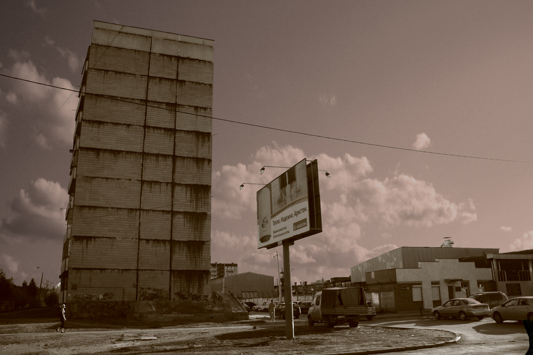 Мне почему-то это фото напоминает Америку, американская заправка, придорожная гостинница, облезлый рекламный щит (с русскими букавками ), а может что-то урбанистическое. |
